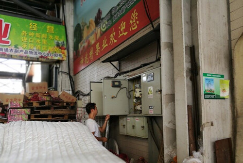 高溫天氣用電量逐漸增大,后勤工作中還是需要對交易區用電負荷進行檢查。物業科電工對水果區、熟食區大棚里的配電總開關進行了安全檢查,兩個區的總體用電情況相對良好,未出現總開關過熱、電流過大等危險情況。對存在安全隱患的攤位,客服中心要求水果區責成經營戶將配電箱及電線附近的雜物進行整理,在配電箱旁邊預留一條通道,便于電工及時對配電開關進行維護,對違規用電、使用不合格電線等也向經營戶提出了整改要求。