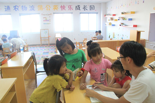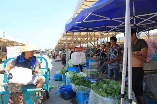 40歲的安徽人李金寶和他老婆一起在交易區(qū)賣菜,他說(shuō)前年隨老鄉(xiāng)來(lái)到南通,在興仁包了50多畝地種植蔬菜,每天凌晨1點(diǎn)鐘起床,和老婆,另外請(qǐng)的兩個(gè)小工一起摘菜、裝筐、裝車到早晨8點(diǎn)鐘,然后開(kāi)車40分鐘到通農(nóng)物流排隊(duì)、繳費(fèi),將近九點(diǎn)鐘開(kāi)始賣,早晨在市場(chǎng)里買兩個(gè)大餅就著礦泉水當(dāng)早餐和中飯,下午賣得快的話兩三點(diǎn)鐘能賣完,最晚五點(diǎn)鐘收攤。他說(shuō)今年氣溫特別高,夏天蔬菜不澆水要干死,白天泥土是燙的,不能給蔬菜澆水,即使晚上泥土也是熱的,給蔬菜澆水的時(shí)候,泥土上騰騰的冒熱氣,很多蔬菜差不多是被燙死的,所以產(chǎn)量特別低,價(jià)錢就貴,以前青菜0.2元/斤的時(shí)候,賣不出價(jià)錢,虧了,種菜賣菜也有風(fēng)險(xiǎn),但跟以前在建筑工地做小工比,好多了,以前苦累不算,還讓家人天天擔(dān)心,現(xiàn)在不去建筑工地了,和老婆來(lái)南通包地一起種菜賣菜,賺多賺少,家人不用擔(dān)心,通農(nóng)物流還給臨時(shí)經(jīng)營(yíng)戶搭建了大棚遮陽(yáng),這比在露天建筑工地做小工日子好過(guò)多了,而且通農(nóng)物流還為外來(lái)經(jīng)營(yíng)戶子女開(kāi)辦了暑期輔導(dǎo)班——蒲公英成長(zhǎng)園,就在水果交易區(qū)會(huì)議室,送過(guò)去很方便。南通大學(xué)志愿者和通農(nóng)物流的年輕員工義務(wù)給孩子輔導(dǎo)暑假作業(yè),讓大家可以安心經(jīng)營(yíng)。
