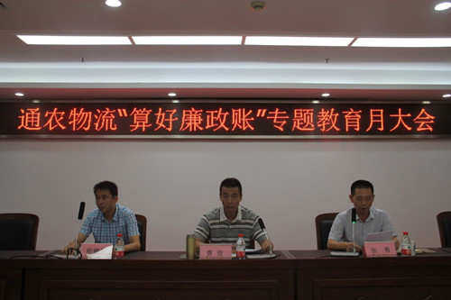 最后,通農(nóng)物流總經(jīng)理曹俊作題為“繃勁廉政弦 算好廉政賬”講話,曹總從八個(gè)方面要求全體黨員管理干部算好人生八筆賬:一要算好政治賬,志高方能致遠(yuǎn);二要算好經(jīng)濟(jì)賬,勤耕方能富足;三要算好名譽(yù)賬,清廉方能揚(yáng)名;四要算好家庭賬,守身方能家圓;五要算好親情賬,品高方能會(huì)友;六要算好自由賬,自律方能無拘;七要算好健康賬,心良方能體壯;八要算好責(zé)任賬,負(fù)責(zé)方能作為。全體黨員干部要切實(shí)抓好各自的廉政八筆賬,按照廉政建設(shè)的要求,用好手中的權(quán)利,做好防腐拒變的防線,保障和促進(jìn)公司又好又快發(fā)展,更好地服務(wù)南通市民。