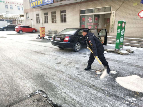 另一方面對所有的公共路面進行撒鹽,對路面起到一個防凍防滑的作用。通過18名保安隊員2個多小時的辛勤奮戰,一直到31日中午太陽把路面冰雪全部融化后,安保部未接到有人在通農物流內因路面結冰路滑而摔倒的報告。