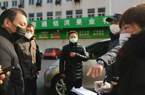 隨后,徐總一行人到交易區和冷庫檢查,要求在門口驗票和收銀的工作人員,要戴好手套和口罩,勤洗手,防護工作一定要做到位,每日噴灑消毒液消毒時也要注意安全。要加強交易區和冷庫的日常巡查,勸導商戶正確配戴口罩。另外,徐總叮囑水果區經理謝雪峰,水果區作為通農物流人員流通較大的交易區之一,一定要做好進場的所有經營戶的籍貫和進貨地登記,嚴查湖北尤其是武漢的來通進場人員,一經查證,立即上報。同時,由于近期浙江溫州確診人員劇增,市場上的溫州來通人員也要立即勸返,不能有任何“漏網之魚”,若有人員不配合離場,立即撥打110報警。(綜合部 洪聰慧)