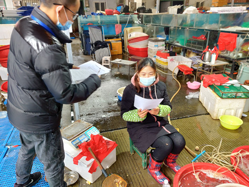 “老板,今年質(zhì)量監(jiān)督檢驗所不能到場給電子秤年檢,需要你們自己用手機注冊登錄上傳信息,這是年審流程,您看一下,有什么不明白的可以來問我們。”11月28日水產(chǎn)區(qū)工作人員挨家挨戶向經(jīng)營戶發(fā)放 《關(guān)于做好市場各類電子秤年檢的通知》,并詳細解釋申報流程。