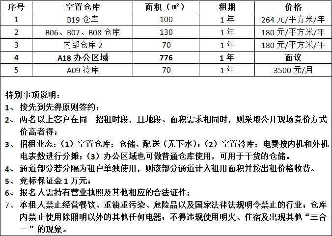 經(jīng)研究,對配送直營部空閑倉庫、冷庫進行公開招租,具體信息如下: