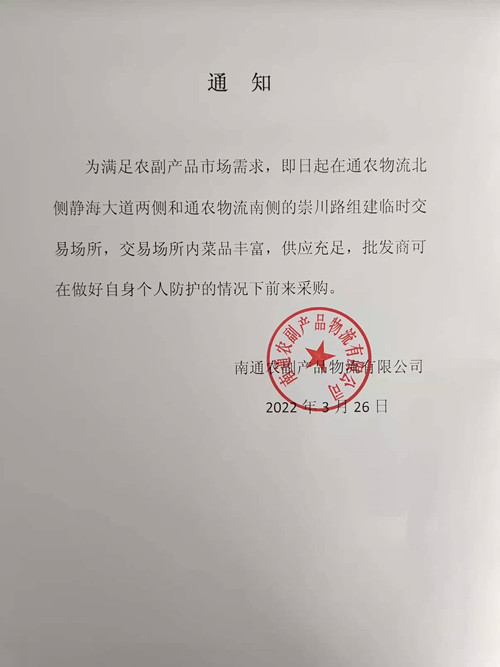 為滿(mǎn)足農(nóng)副產(chǎn)品市場(chǎng)需求,即日起在通農(nóng)物流北側(cè)靜海大道兩側(cè)和通農(nóng)物流南側(cè)的崇川路組建臨時(shí)交易場(chǎng)所,交易場(chǎng)所內(nèi)菜品豐富,供應(yīng)充足,批發(fā)商可在做好自身個(gè)人防護(hù)的情況下前來(lái)采購(gòu)。