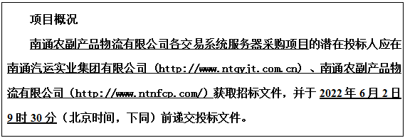 南通通城建設(shè)工程項(xiàng)目管理有限公司(以下稱代理機(jī)構(gòu))受南通農(nóng)副產(chǎn)品物流有限公司 (以下稱采購人)的委托,就其南通農(nóng)副產(chǎn)品物流有限公司各交易系統(tǒng)服務(wù)器采購項(xiàng)目組織公開招標(biāo),誠邀符合條件的潛在投標(biāo)人參加投標(biāo)。