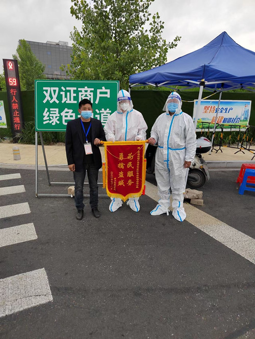 因?yàn)榇舜渭皶r(shí)挽回了市場干貨區(qū)商戶的冰糖、飲料,水果區(qū)商戶的西瓜及榴蓮,得到市場經(jīng)營戶由衷地感謝。5月19日早上6點(diǎn),水果區(qū)經(jīng)營戶王發(fā)華就親自到南大門一線防疫卡口送上錦旗,錦旗上印有“勇擒盜賊,為民服務(wù)”。這面紅艷艷的錦旗,承載著經(jīng)營戶對通農(nóng)物流員工的肯定與支持,是滿含著真摯的感謝與誠摯的敬意。