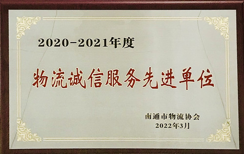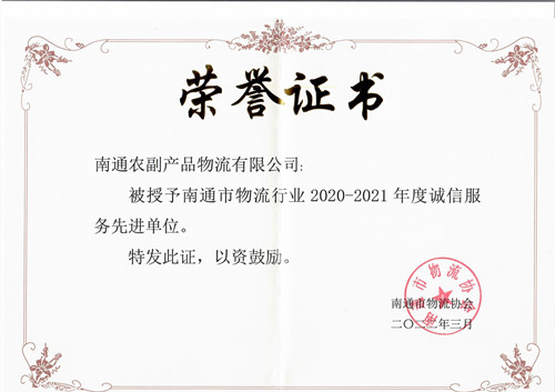 2022年3月,南通農副產品物流有限公司通過南通市物流協會的復核審查,再次榮獲“南通市物流行業2020-2021年度誠信服務先進單位”稱號。