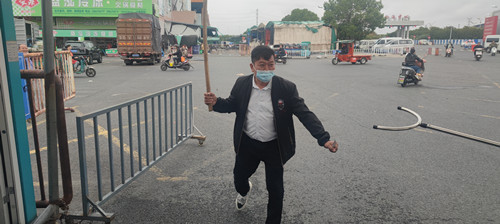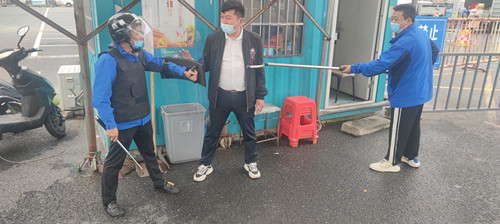 防恐反恐演練領導小組的組長由經理范一凡擔任,副組長由副經理繆亞山擔任,班組長及以上成員參加了本次演練。演練過程如下:1.交易區門口出現一名持刀歹徒(由經營戶扮演)突然出現試圖闖入交易區。2.門崗人員立即關閉交易區大門并手提警棍上前阻止,立即報公司領導。3.通訊組立即通報交易區員工不要接近交易區門口,避免被歹徒行兇致傷。4.疏散組組織員工和經營戶疏散到2號大廳。5.門崗人員迅速打110報警(此項為模擬)。組長范一凡發布緊急命令,交易區防恐反恐應急救援隊全體成員手持防暴叉、警棍等將“歹徒”制服。