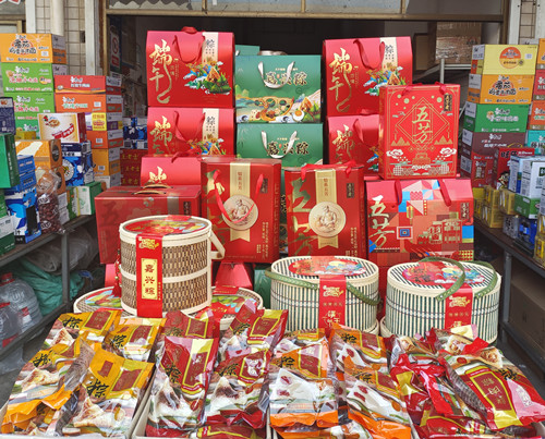 端午節臨近,在干貨大廳的店鋪里粽子已悄然上市,有禮盒裝的、袋裝的,粽子禮盒琳瑯滿目。走進店鋪內,店鋪老板在為顧客挑選、打包。店鋪老板推出了不同品牌、不同口味的粽子,袋裝粽子普遍售價在10元以下,禮盒裝粽子價格在50元到80元不等,口味以傳統的白米、鮮肉、蜜棗、蛋黃、豆沙為主。