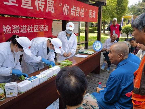 食安部檢測員們現場展示了農藥殘留快速檢測的方法和流程,并耐心解答居民疑問。“還沒見過怎么檢測呢,現在檢好了晚餐吃得更放心呢!”,社區居民爭先拿出了自己買的菜前來檢測。