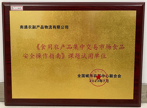 為切實加強食用農(nóng)產(chǎn)品的食品安全工作,通農(nóng)物流積極參與成為國家市場監(jiān)督管理總局監(jiān)制的《食用農(nóng)產(chǎn)品集中交易市場食品安全操作指南》課題試用單位。2023年7月,被全國城市農(nóng)貿(mào)中心聯(lián)合會授予《食用農(nóng)產(chǎn)品集中交易市場食品安全操作指南》課題試用單位牌匾。
