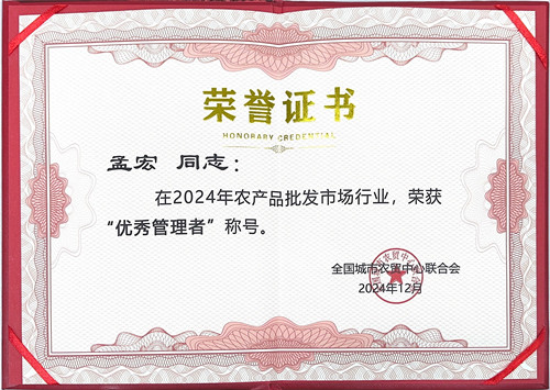 12月3日,全國城市農(nóng)貿(mào)中心聯(lián)合會(huì)召開“2024年中國農(nóng)產(chǎn)品批發(fā)行業(yè)年會(huì)暨第八屆中國農(nóng)產(chǎn)品供應(yīng)鏈大會(huì)”,會(huì)上通農(nóng)物流榮獲 “2024年度農(nóng)產(chǎn)品批發(fā)市場行業(yè)經(jīng)銷商最滿意市場”稱號(hào),同時(shí)蟬聯(lián)“2023年度農(nóng)產(chǎn)品批發(fā)市場行業(yè)百強(qiáng)市場”,總經(jīng)理孟宏榮獲“2024年農(nóng)產(chǎn)品批發(fā)市場行業(yè)優(yōu)秀管理者”榮譽(yù)稱號(hào)。