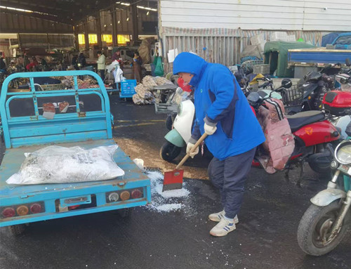 受冷空氣影響,連日來通城氣溫急劇下降。由于蔬菜運輸過程中可能產生的大量水分,加之天氣因素的疊加效應,近日蔬菜區大棚地面出現了結冰現象。為防止地面濕滑,確保市場內的人員和車輛通行安全,員工們正忙碌地使用大鏟子,在地面上均勻地撒上一層薄薄的鹽。鹽能夠吸收地面的水分,顯著降低地面的濕滑程度,從而有效防止人員滑倒和車輛打滑事故的發生。通過上述措施,有效應對了寒冷天氣帶來的安全隱患,有力保障了市場內的安全與秩序。(蔬菜部 單金晶)